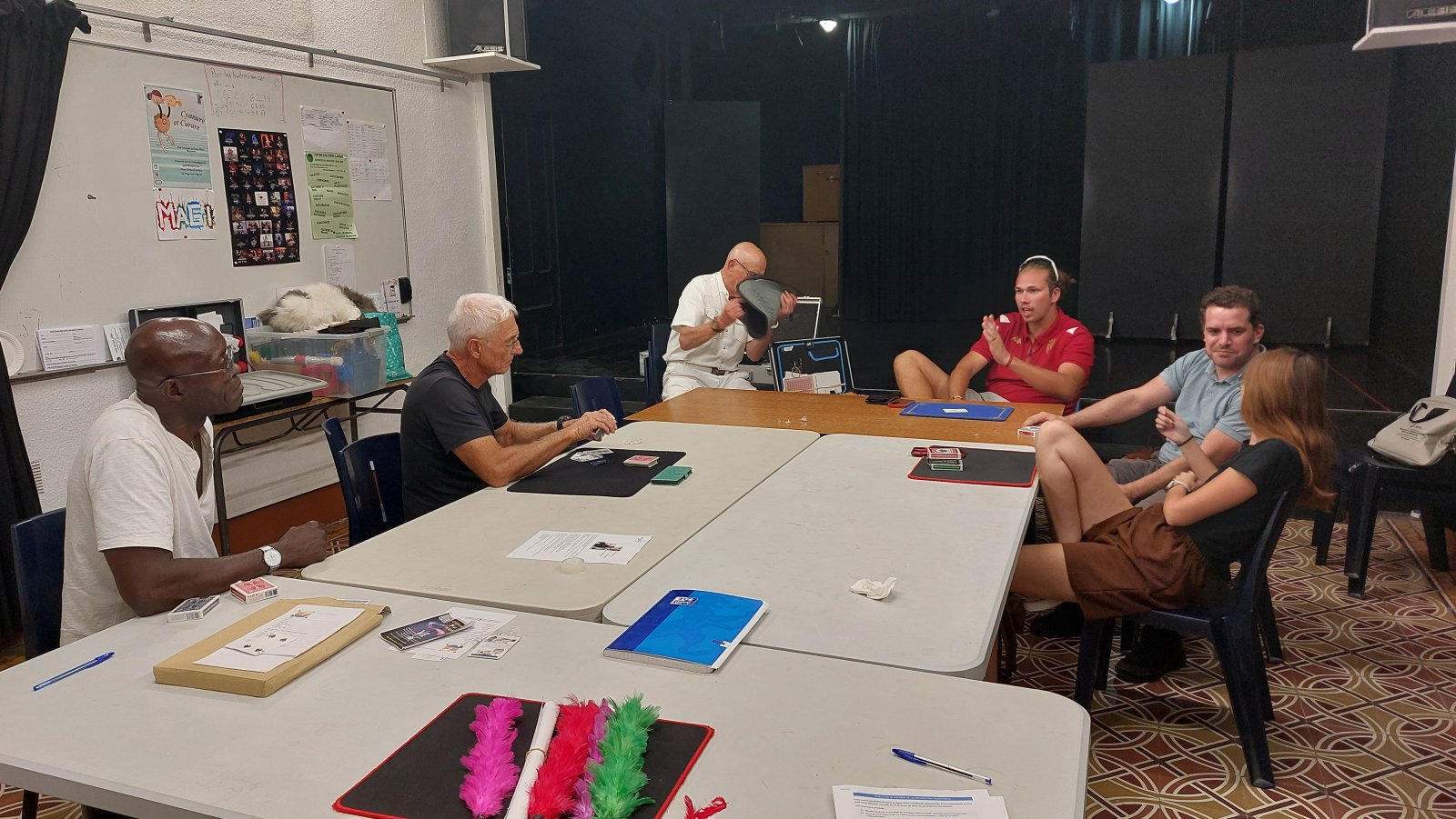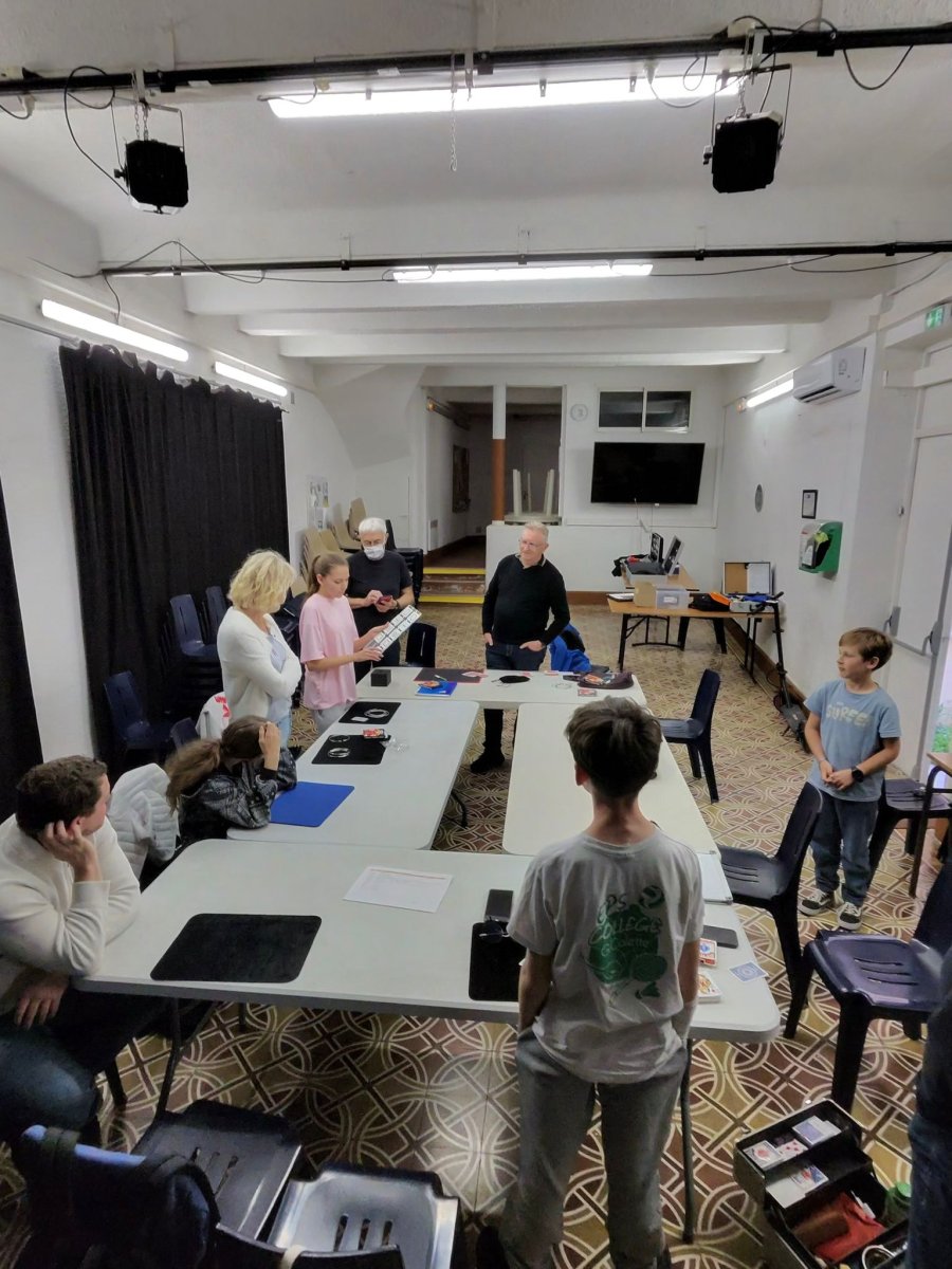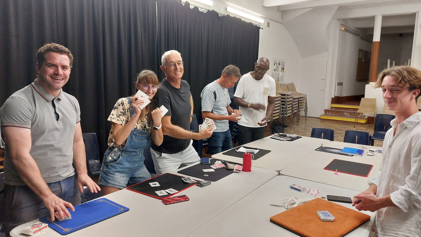 Groupe débutants pris en charge par Pascal et Bern'Art : 2 enfants Adèle et Max / 2 adultes Gérard et Laurent. Manipulation des cartes