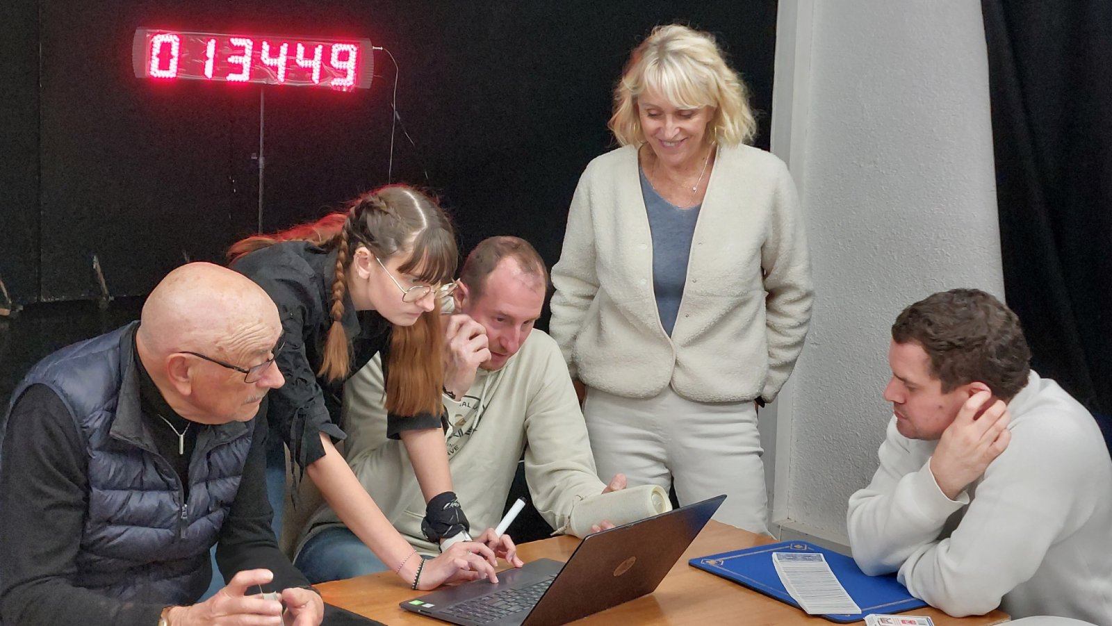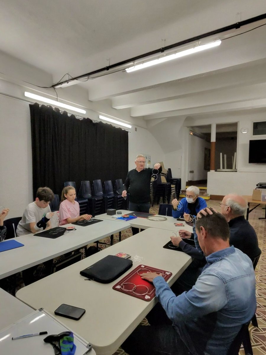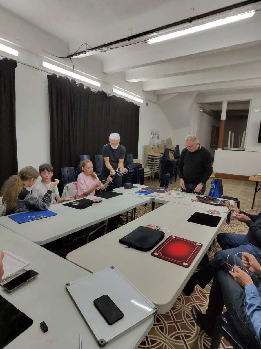 Groupe débutants pris en charge par Pascal et Bern'Art : 2 enfants Adèle et Max / 2 adultes Gérard et Laurent. Manipulation des cartes