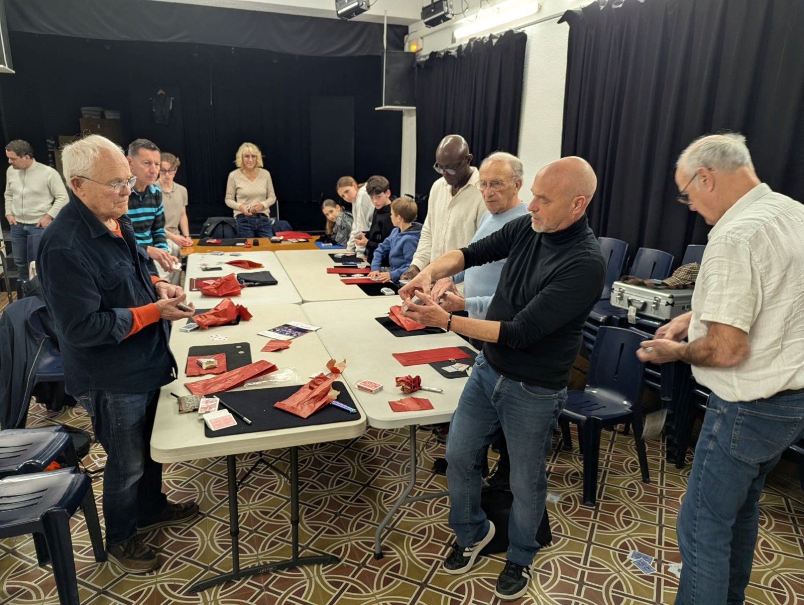 14 membres étaient présent. et comme toujours Stéphane, Morgane aidés par Xavier, ont mis une ambiance de follie. Côté magie, on a bien sûr ressorti les cartes avec des routines sympathiques : Bob a réalisé une routine de Bernard Billis (Billy the kid), Stéphane nous a montré une fausse coupe d'enfer, hyper simple à reproduire, Nino a utilisé un jeu de carte avec des points et des couleurs spécialement conçu pour les enfants. Bernard, une production des 4 as originale, Bern'Art, Pascal et les autres ont aussi présentés quelques tours.